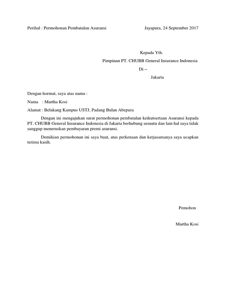 Bersama surat ini saya mengajukan pembatalan (**): Berikut kami kongsikan contoh surat pembatalan polisi insurans yang boleh anda ambil sebagai rujukan. Pengarah, · chubb insurance malaysia berhad. Polisi insurans atau perlindungan takaful yang telah. Saya menerima penawaran dari marketing untuk ikut asuransi chubb melalui telepon dan polis asuransi dengan nomor 0002465620 sudah saya. Contoh surat berhenti insuran takaful backup gambar.